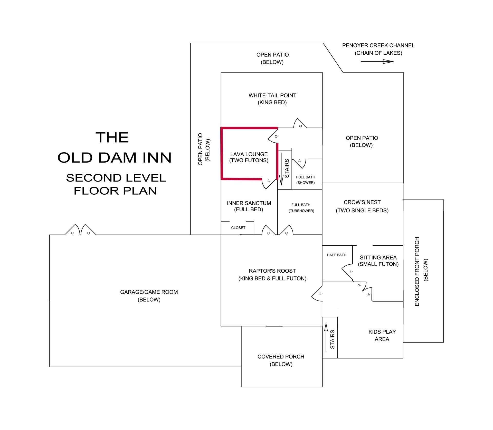 The Lava Lounge is a small bedroom on the second floor of The Old Dam Inn. It features a collection of Lava Lamps, a flat screen TV and two colorful futons that can be opened to make either two single beds or one queen size bed. The Lava Lounge is connected to the Inner Sanctum Bedroom and the two can be used as a private suite, with a full bathroom in the adjacent hall. The Lava Lounge is very popular with our younger guests because it can be used as a TV viewing room as well as a private bedroom.