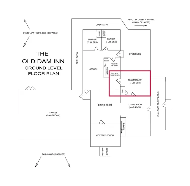 "Newaygo Newt" was a local poet and teller of tall tales (real name Ernest Jack Sharpe) and good friend of the former owner of The Old Dam Inn, Dick Black. This bedroom features an antique full-size brass bed, writing desk, closet, flat screen TV and a private full bathroom with tub/shower. Newt's Nook is on the first floor, next to the Living Room/Map Room. It has views of the Penoyer Creek Channel, the patio and fire pit area. Newt's Nook is ideal for the senior members your group, or those who have difficulty with stairs since it has a private bathroom and is on the first floor.