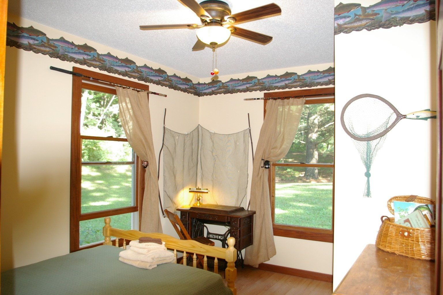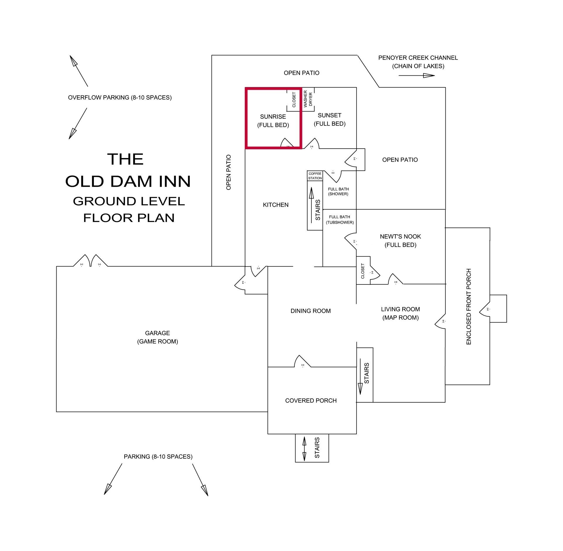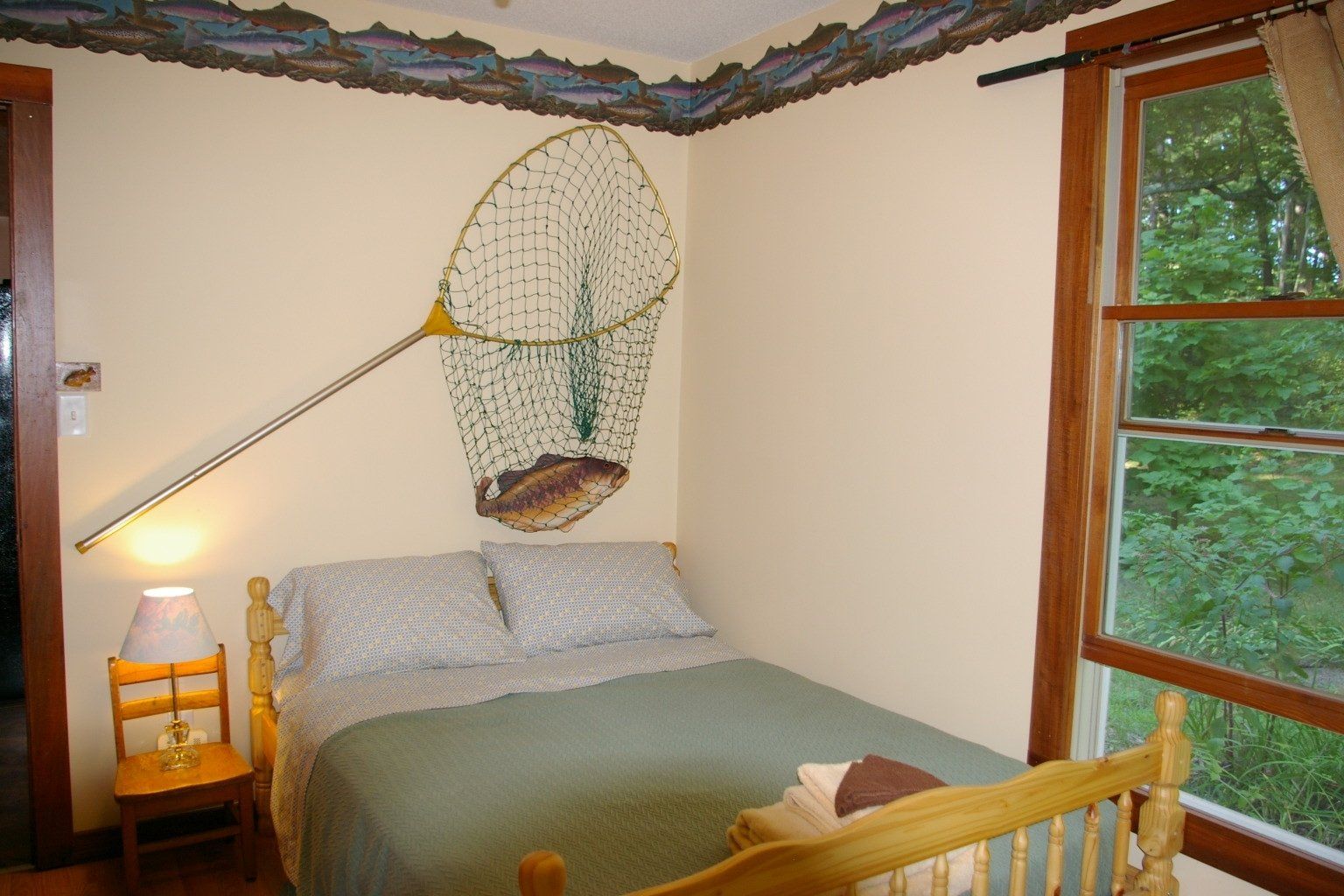 The Sunrise Bedroom is on the first floor of The Old Dam Inn, in the back hall near the kitchen. It features views of the woods on the sunrise side of the house. There is a full-size bed, closet, writing desk, ceiling fan and a small dresser. Sunrise is the closest bedroom to the coffee station in the kitchen so it is great for the early risers in your group. A full bath is located across the hall.